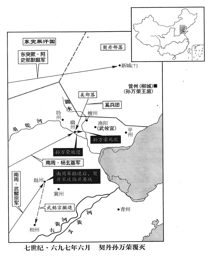 9、八月一日,武延秀抵达黑沙(内蒙古阴山山脉北)东突厥南王庭。阿史那默啜对阎知微等说:“我打算把女儿嫁给李姓皇家,怎么冒出来姓武的小子?他难道是天子的儿子!我们突厥人,世代受李姓皇家的恩典,听说李姓皇家全被消灭,只剩下两个儿子还活着,我现在就率军南下,辅佐他们登基!”于是逮捕武延秀,囚禁在另一个地方,而封阎知微当南面可汗,意思是使他集结唐王朝的遗民。于是出动大军,攻击静难军(地望在北京市延庆县)、平狄军(山西省代县北)、清夷军(河北省怀来县)等基地。静难军基地司令(静难军使)慕容玄崱(音zè“〔仄〕”)率部众五千人向东突厥投降,蛮虏声势振奋,进击妫州(河北省怀来县)、檀州(北京市密云县)等州。上一次随阎知微前往东突厥的南周政府官员,阿史那默啜都发给他们五品、三品官服;武曌下令把它们全部没收。