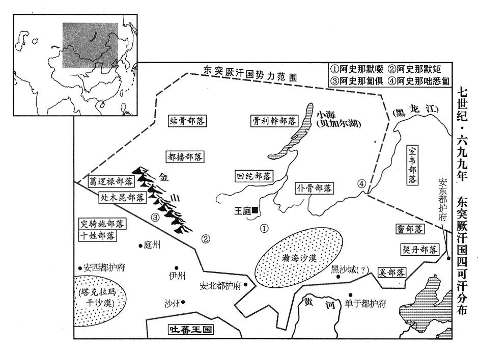 21、西突厥汗国(新疆东北部及中亚东部)十姓部落,自七世纪八〇年代后期以来,受到东突厥汗国(指大可汗阿史那骨笃禄)的骚扰掠夺,大量逃跑及死亡,剩下的人寥寥无几。濛池都护(都护府设咸海及伊塞克湖之间)、继往绝可汗(十七任大可汗)阿史那斛瑟罗,集合残余部众六七万人,迁入中国内地。