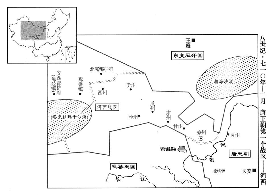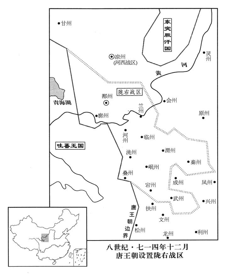 49、十二月十一日,设置陇右战区司令长官(陇右节度大使),辖区包括:鄯州(青海省乐都县)、秦州、河州(甘肃省临夏市)、渭州、兰州、临州(甘肃省临洮县)、武州(甘肃省武都县)、洮州(甘肃省临潭县)、岷州(甘肃省岷县)、廓州(青海省化隆县)、叠州(甘肃省迭部县)、宕州(甘肃省舟曲县)十二州;由陇右警备区副司令(陇右防御副使)郭知运担任。
