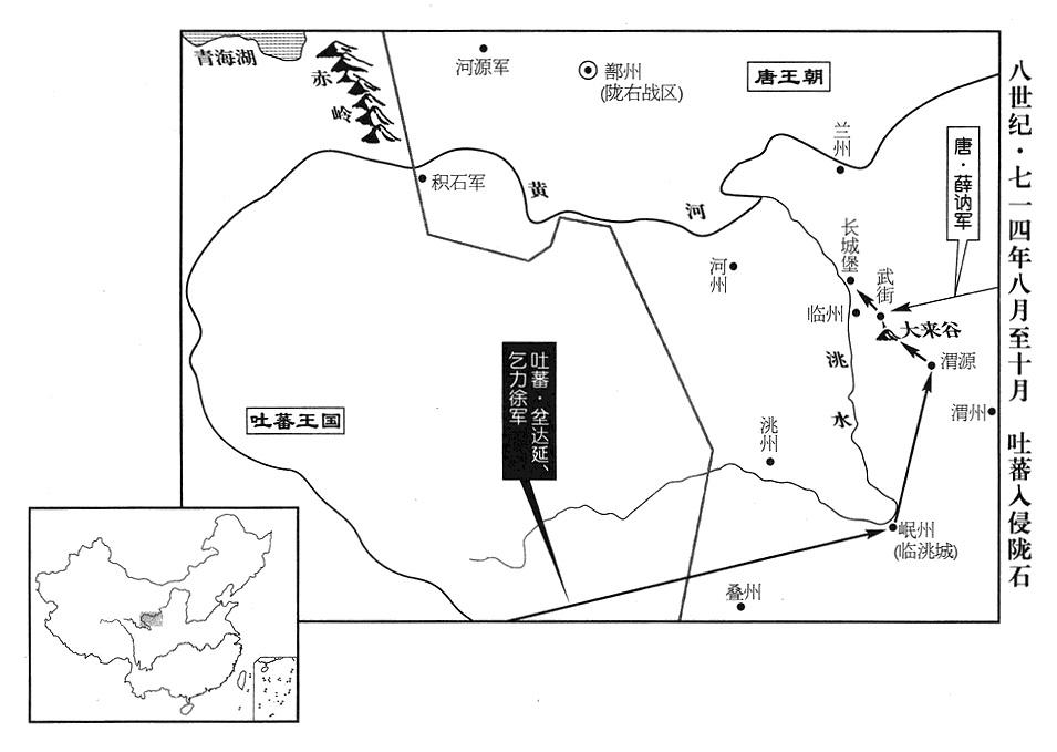 35、八月二十日,吐蕃王国大将坌达延、乞力徐率大军十万,攻击临洮(临洮军基地·青海省乐都县),进军兰州(甘肃省兰州市),前锋抵达渭源(甘肃省渭源县),抢掠牧场中的马匹(果如解琬所料)。唐政府命薛讷以平民身份摄理左羽林(禁军第一军)将军,当陇右警备区(陇山以西)司令(陇右防御使);命右骁卫(卫军第六军)将军、常乐(甘肃省安西县“〔瓜州城西〕”)人郭知运当副司令(副使);会同畜牧部副部长(太仆少卿)王晙,共同率军出击。