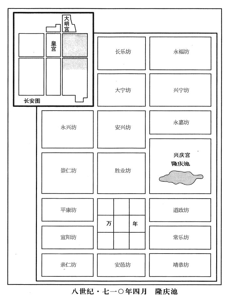 5、最初,南周王朝时代,长安城东一带住民王纯家里有口水井,井水忽然从井口溢出,无法堵塞,终于流成一个数十顷大的小湖,称隆庆池(池在隆庆坊南,故名),相王李旦的五个儿子(寿春王李成器、衡阳王李成义、临淄王李隆基、巴陵王李隆范、彭城王李隆业)住宅都在池北,望气家警告李显说:“那里有一种非常浓厚的帝王之气,最近越发强烈。”