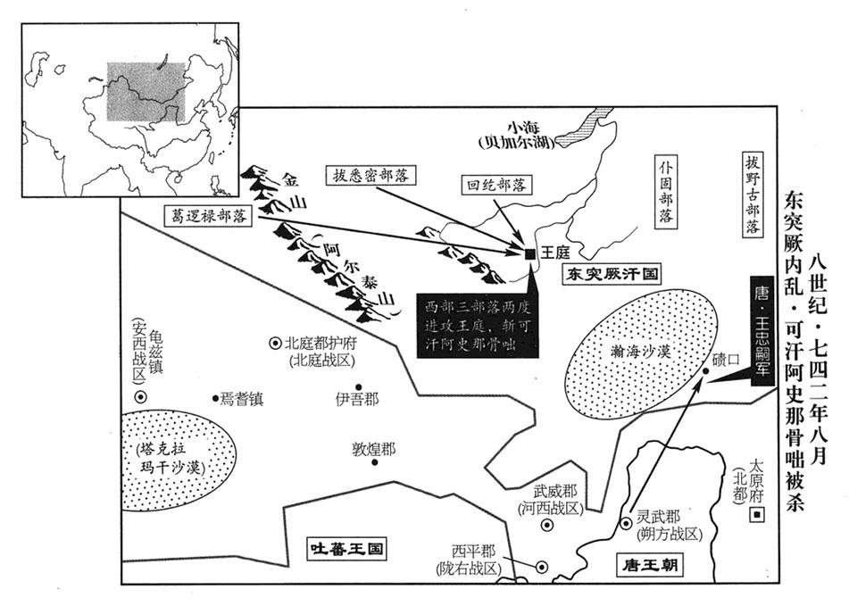 李隆基诏令朔方战区(总部设灵武“〔宁夏灵武市〕”)司令官王忠嗣乘虚出军,挺进到萨河内山(今地不详),击破左翼阿波达干等十一个部落,再攻右翼,还没有攻破。正巧回纥部落(王庭设蒙古国哈尔和林市)与葛逻禄部落(中亚额尔齐斯河流域)联军攻击颉跌伊施可汗(二十七任大可汗),斩颉跌伊施可汗。回纥部落(王庭设蒙古国哈尔和林市)酋长药罗葛骨力裴罗遂自称骨咄禄毗伽阙可汗(回纥汗国第一任可汗),派使节前来长安,请求承认。李隆基封药罗葛骨力裴罗当怀仁可汗。此时东突厥汗国溃散,骨力裴罗遂率部众南下,进入东突厥汗国留下的真空地带,在乌德犍山(蒙古国杭爱山)建立中央御帐。回纥汗国原来统辖药罗葛等九个姓,后来又并吞拔悉密、葛逻禄两个部落,共十一个部落,每部落都设一个总司令(都督),遇到作战,总是命新归附的两个部落担任先锋。