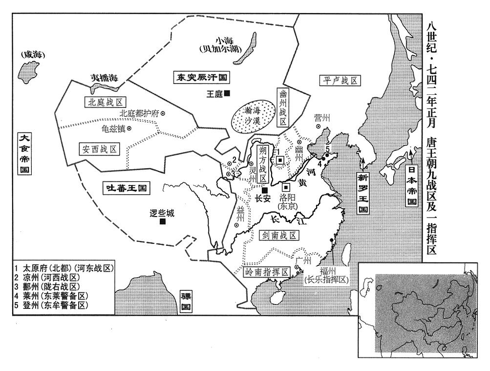 当时,唐帝国势力范围包括实质州三百三十一州、名义州(羁縻州)八百州,共九个战区(节度)、一个军事指挥区(经略),用以增强边疆防务。