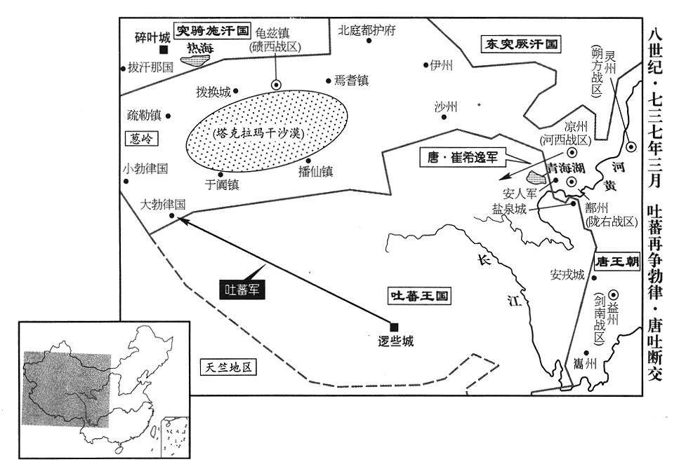 5、三月二十五日,河西战区(总部设凉州“〔甘肃省武威市〕”)司令官崔希逸袭击吐蕃王国(首都逻些城“〔西藏拉萨市〕”),在青海湖西击破吐蕃军。