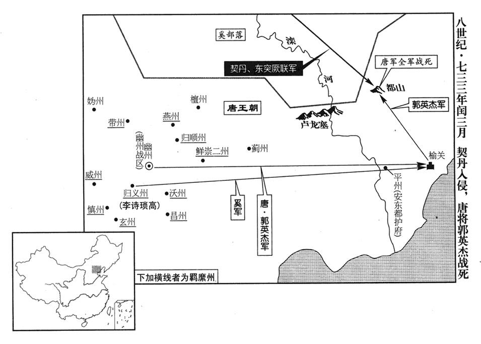 6、闰三月六日,幽州兵团副总司令(幽州道副总管)郭英杰跟契丹部落(辽河上游)在都山(河北省迁安县北)会战,阵亡。