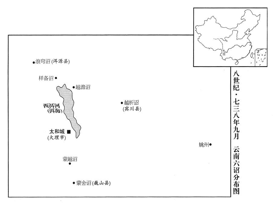 蒙归义的祖先,本来是哀牢夷(参考六九年),居住姚州(云南省姚安县)之西,东南跟交趾(越南北部)相接,西北跟吐蕃相接(洱海蛮,参考六四八年四月)。蛮语把“王”称作“诏”,最初,有六个“诏”(王);蒙舍诏(云南省巍山县)、蒙越诏(云南省巍山县西北)、越析诏(云南省宾川县)、浪穹诏(云南省洱源县)、样备诏(云南省洱源县东南邓川镇)、越澹诏(样备诏东南),各诏(王)的军力相等,谁都不服谁,无法统一,中国历代王朝也高兴他们这种分裂。蒙舍诏在最南方,所以也称南诏。唐王朝三任帝李治在位时,蒙舍诏(王)细奴逻首先到唐王朝朝贡(《资治通鉴》中最早出现的,却是浪穹诏,参考六八九年五月)。细奴逻生逻盛、逻盛生盛逻皮、盛逻皮生皮逻阁(“六诏”人是连名制,儿子用父亲名字最后一字当姓)。皮逻阁当王时,蒙舍诏逐渐强大,其他五诏逐渐衰落。
