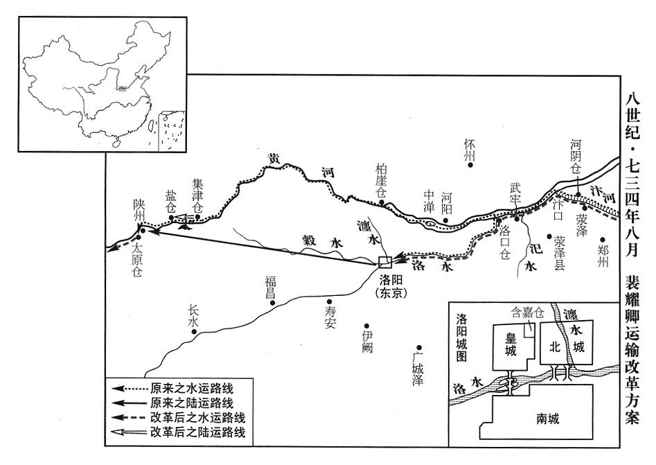 “因此我建议:使农林部(司农)所收到的所有粮食都集中东都,由东都再转运西上,充实关中的粮食,假设关中能储备可供数年的粮食,就不必再担心水灾旱灾。而且江南(长江以南)的船只,对北方水道不太熟悉,所以走一站、停一站,拖延的时间一久,窃盗吞没之心油然而生。我再建议在河口兴筑粮仓(河口,汴水注入黄河之口·河南省郑州市西北),使江南(长江以南)船只到此之后,卸下粮食,即行折回。政府再自行雇船,分别驶进黄河、洛水。