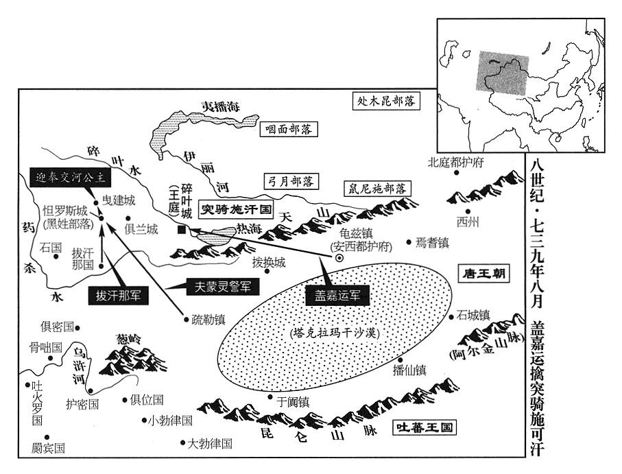 盖嘉运进攻碎叶城(突骑施王庭·吉尔吉斯斯坦托克马克城),吐火仙可汗骨啜出战,不能抵挡,逃走,碛西兵团追击,追到贺逻岭(今地不详),把骨啜生擒。盖嘉运再派疏勒(新疆喀什市)镇守司令(疏勒镇守使)夫蒙灵詧(夫蒙,复姓)会同拔汗那国(中亚纳曼干市)国王阿悉烂达干,率军暗中进入怛罗斯城(中亚江布尔市),生擒黑可汗尔微;于是乘势突入曳建城(中亚江布尔市西北),迎奉交河公主(交河公主事,参考七二二年十二月),把所有蛮夷都交给拔汗那国王阿悉烂达干,声威震慑西域。