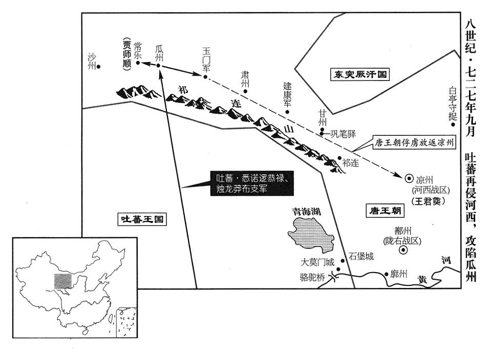 2、三月,瓜州军区(总部设甘肃省安西县)总司令张守珪、沙州(甘肃省敦煌市)州长贾师顺攻击吐蕃王国(首都逻些城“〔西藏拉萨市〕”)大同军(敦煌市西南),大破吐蕃军。