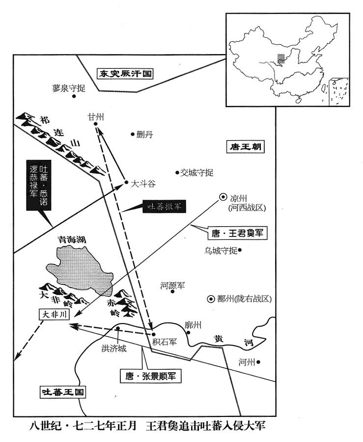 去年(七二六年)冬季,吐蕃大将悉诺逻恭禄攻击大斗谷(即大斗拔谷·甘肃省山丹县南),挺进到甘州,纵火焚烧房屋,掳掠人口牲畜,向南撤退。王君㚟推测吐蕃军疲惫,率军在后面尾追,恰巧,天降大雪,吐蕃军很多人冻死,好不容易抵达积石军(青海省贵德县),向西转进,打算回国。王君㚟事先派人从小路绕道进入吐蕃国境,把沿路的草木焚烧一光。悉诺逻恭禄进抵大非川(青海湖以南),打算休息兵马,而荒野上草木已被烧尽,战马饿死一大半。王君㚟会同秦州军区(总部设甘肃省天水市)总司令张景顺,尾追不舍,到达青海湖西,踏冰渡河,而吐蕃军已经过去,于是击破吐蕃军的殿后部队,掳获军用物资以及羊马,以万为单位计算,班师。
