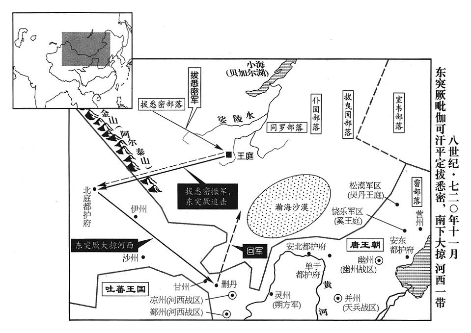 最初,朔方兵团总司令官(朔方大总管)王晙(本年六月,王晙官衔是“朔方大使”,此时追叙,又是“朔方大总管”,不知是否有误,类此混淆不清的记载很多,当无法确认时,就照原文)上疏建议:西方征调拔悉密部落(蒙古国科布多盆地北部),东方征调奚部落(滦河上游)、契丹部落(辽河上游),定于本年秋季秘密会师,攻击设于稽落水(流经西伯利亚恰克图城南)的东突厥毗伽可汗(二十一任大可汗)阿史那默棘连的中央御帐。阿史那默棘连得到消息,大为恐惧,智囊暾欲谷说:“用不着害怕,拔悉密部落位于西方,跟奚部落、契丹部落相距遥远(两地航空距离二千三百千米,从如此遥远的两地发动夹击,恐怕是最笨的战略),无法呼应。而唐王朝本土的朔方兵团,也不可能远渡沙漠,到达此间;即令到达,我们只要把中央御帐向北先行迁徙三天,唐军粮食吃完,就会自己撤退。至于拔悉密部落,行动轻率,只看见利,却看不见害,得到王晙的指令,一定喜不自胜,先期抵达。王晙跟宰相张嘉贞,谁都不服谁,王晙奏请的事,张嘉贞定会从中刁难,难得中央同意,所以王晙绝对不敢出征。唐军不到,拔悉密部落单独前进,我们迎头痛击,把它消灭,轻而易举。”