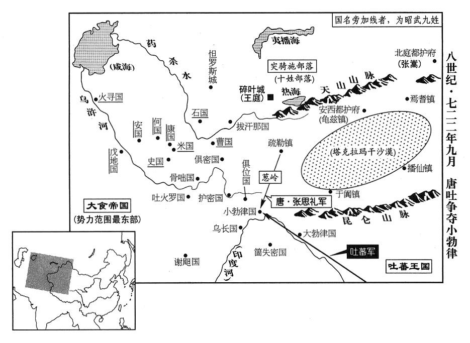 15、九月十五日,吐蕃王国(首都逻些城“〔西藏拉萨市〕”)包围小勃律国(克什米尔吉尔吉特市),国王没谨忙(没,姓)向唐王朝北庭战区(总部设北庭府“〔新疆吉木萨尔县〕”)司令官张嵩(张孝嵩)求救,说:“小勃律是大唐西方的门户,小勃律灭亡,西域(新疆及中亚东部)将全部沦入吐蕃之手。”