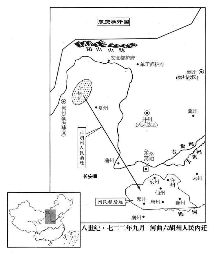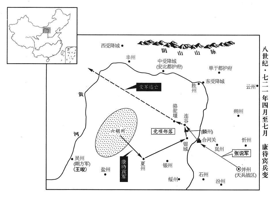 17、康待宾(参考去年“〔七二一年〕”四月)的余党康愿子聚众起兵,自称“可汗”。一级实质宰相(同中书门下三品)张说出军讨伐,把他生擒,变乱完全平息。唐政府遂把河曲(河套·鄂尔多斯高原)六州残余胡人部落五万余人,强行迁移到许州(河南省许昌市)、汝州(河南省汝州市)、唐州(河南省泌阳县)、邓州(河南省邓州市)、仙州(河南省叶县西南)、豫州(河南省汝南县);河南(河套·鄂尔多斯高原)及朔方(宁夏灵武市)一带,河曲(河套)土地千里,成为真空(六州,即六胡州:鲁州、丽州、含州、塞州、依州、契州。六州分布在今内蒙古鄂托克旗一带)。