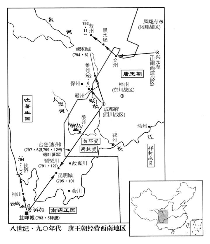 21、吐蕃军五万人分别攻击南诏王国(首都苴咩城“〔云南省大理市〕”)及巂州(四川省西昌市)。南诏国王(三任)异牟寻及西川战区司令官韦皋各出军抵抗,吐蕃军不能取胜,撤退。