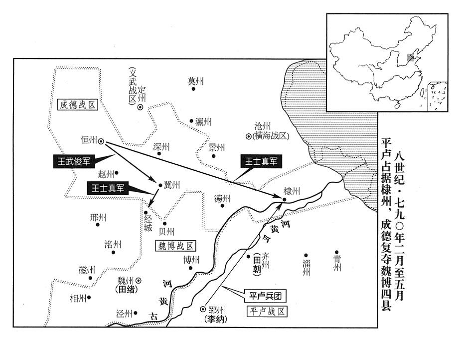 4、五月,王武俊率大军进驻冀州(河北省冀州市),准备攻击赵镐,赵镐率部属逃往郓州(平卢战区总部·山东省东平县)。李纳派军进入棣州据守。田绪派执行官(判官)孙光佐前往郓州,宣读伪造的皇帝诏书,把棣州划归平卢战区。王武俊大发雷霆,派他的儿子王士清攻击贝州,占领经城(河北省威县北经镇)等四县。