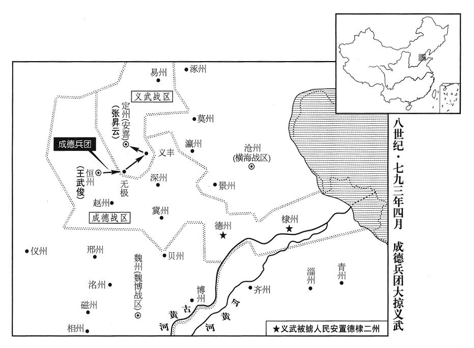 23、最初,平卢战区司令官李纳,因为棣州(山东省惠民县)所属蛤地方(惠民县南)是产盐重地,遂修筑城池,派军据守。又派军进驻德州(山东省陵县)以南的三汊城(陵县东南),保护通往魏博战区(总部设魏州“〔河北省大名县〕”)的交通要道。而今,李师古继承李纳职位,成德战区(总部设恒州“〔河北省正定县〕”)司令官王武俊,看李师古年少,没把李师古瞧到眼里,于是,就在本月,派军进驻德州、棣州,准备攻击蛤城(惠民县南)及三汊城。李师古命将领赵镐率军抵抗。