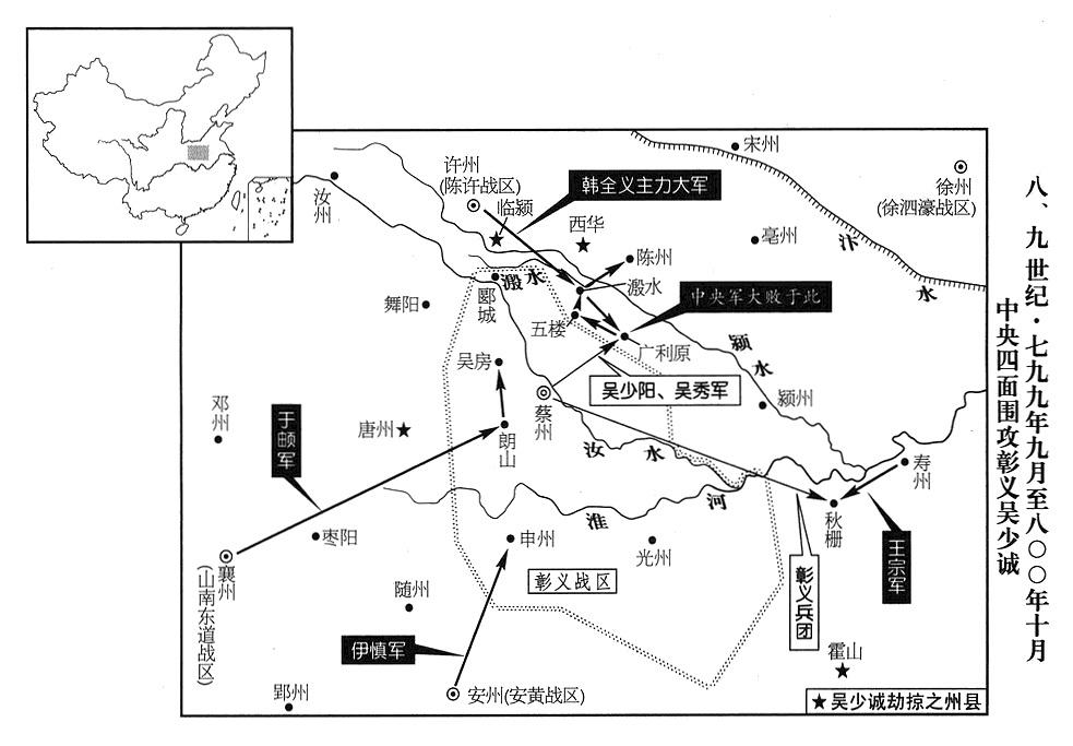 17、山南东道战区(总部设襄州“〔湖北省襄樊市〕”)司令官于頔、安黄战区司令官伊慎、寿州(安徽省寿县)州长王宗以及陈许战区司令官上官涚、宣武战区司令官韩弘,联合进攻吴少诚(彰义“〔总部蔡州〕”首领),不断把吴少诚军击败。(据《新唐书·伊慎传》及《藩镇彰义传》,伊慎从安州出兵,攻击彰义的申州“〔河南省信阳市〕”,而王宗则在秋栅“〔安徽省霍丘县北〕”击败彰义兵团。)