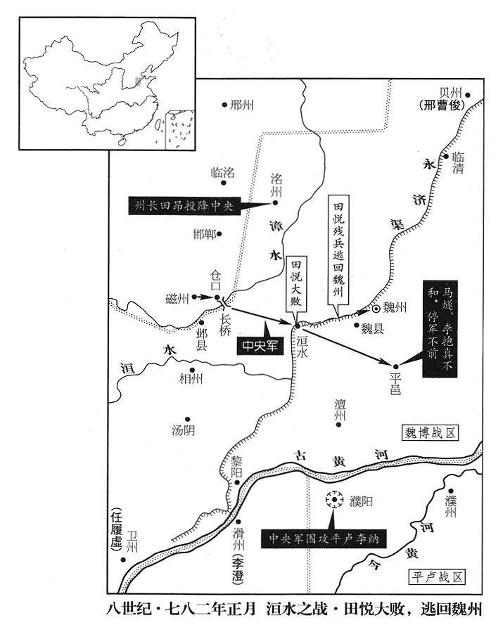 这时候,平卢战区司令官李正己已经逝世(本年四十九岁),他的儿子李纳封锁消息,不对外宣布,自行主持战区军政。田悦失败后,向李纳及李惟岳求救,李纳派大将卫俊,率军一万人,李惟岳派军三千人,分别增援。田悦集结散兵游勇,有两万余人,在洹水(流经河南省安阳市)扎营。平卢特遣兵团驻扎东翼、成德特遣兵团驻扎西翼,前后左右,互相呼应。马燧率各军返抵邺城,上疏请河阳战区派军相助,李适命河阳战区司令官李艽增援会师。