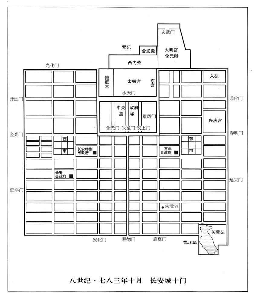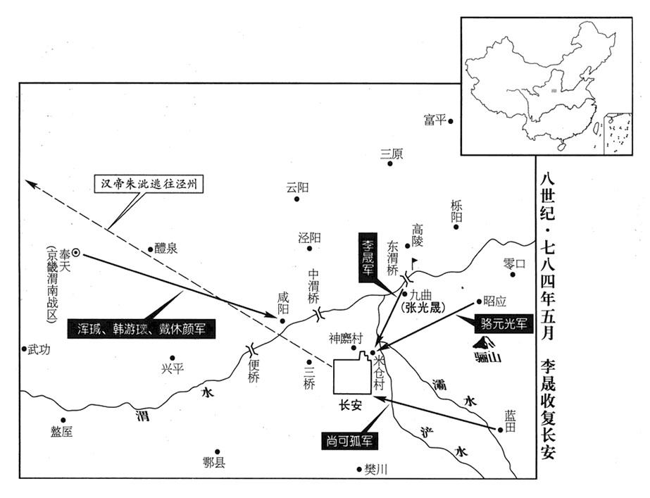 五月二十五日,李晟推进到长安光泰门(长安苑城东北门)外的米仓村(长安城东北)。