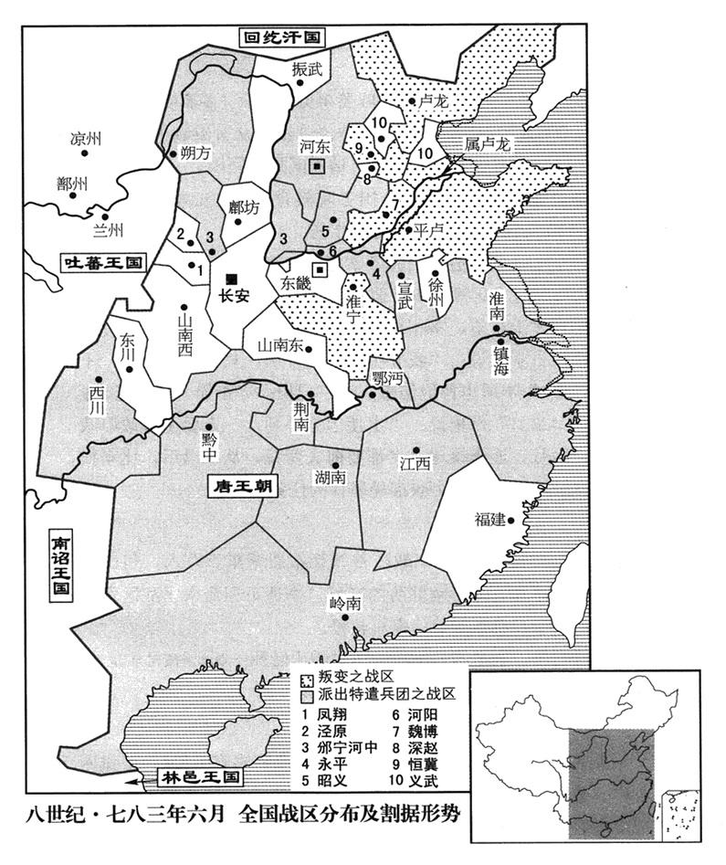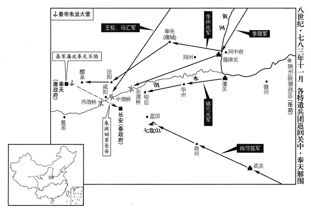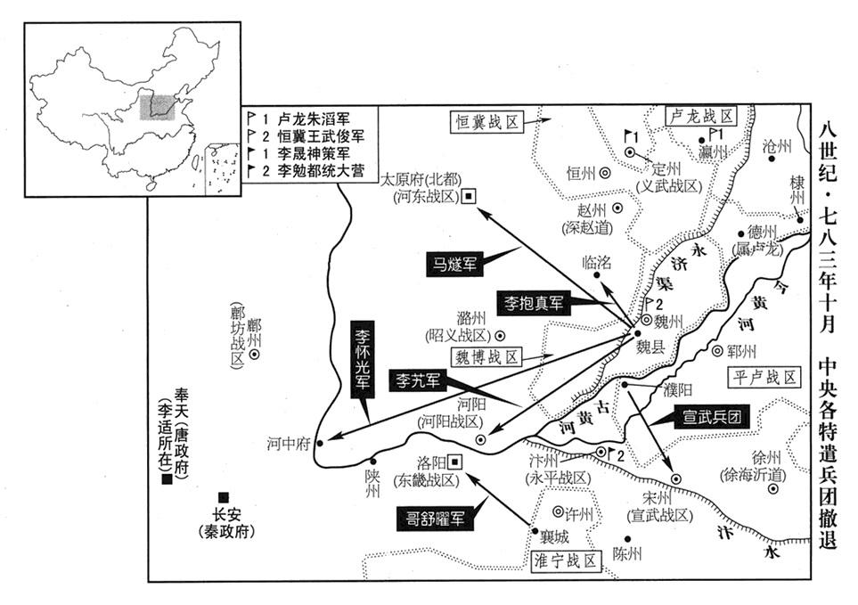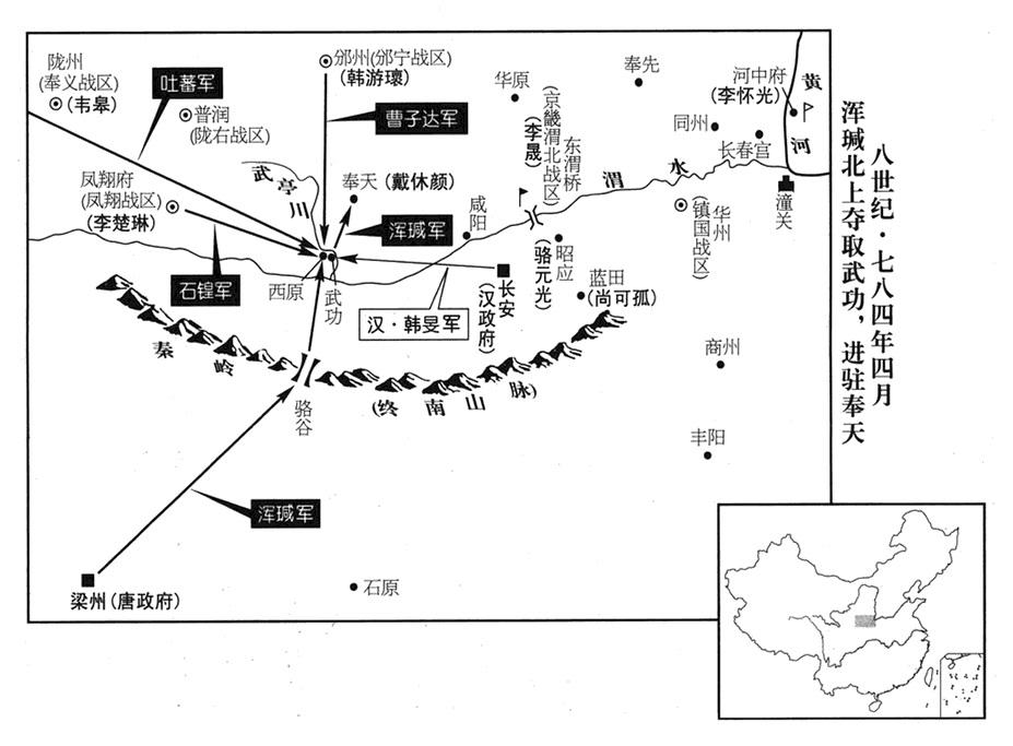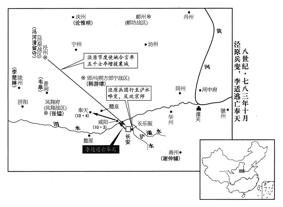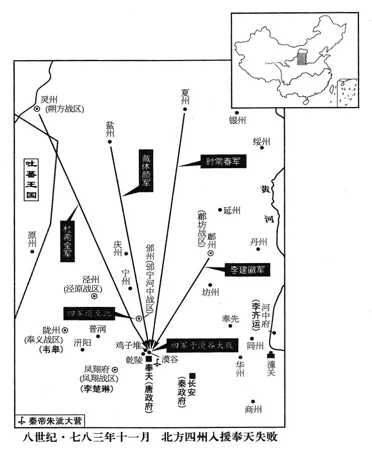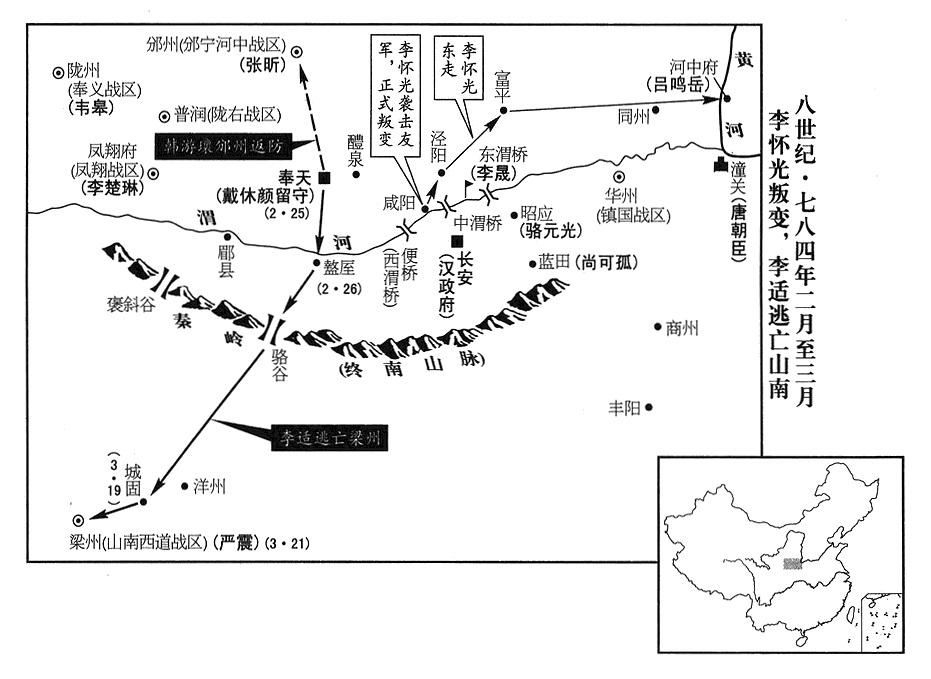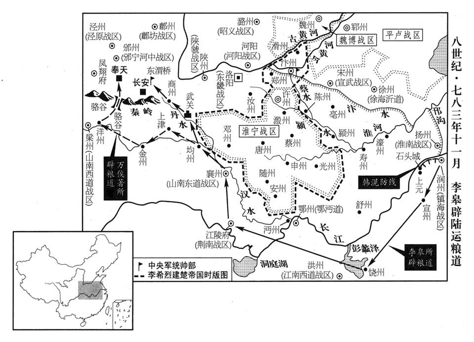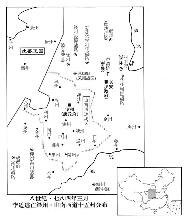 20、七月二十四日,命邠宁战区(总部设邠州)司令官李怀光兼朔方战区司令官。