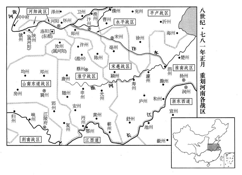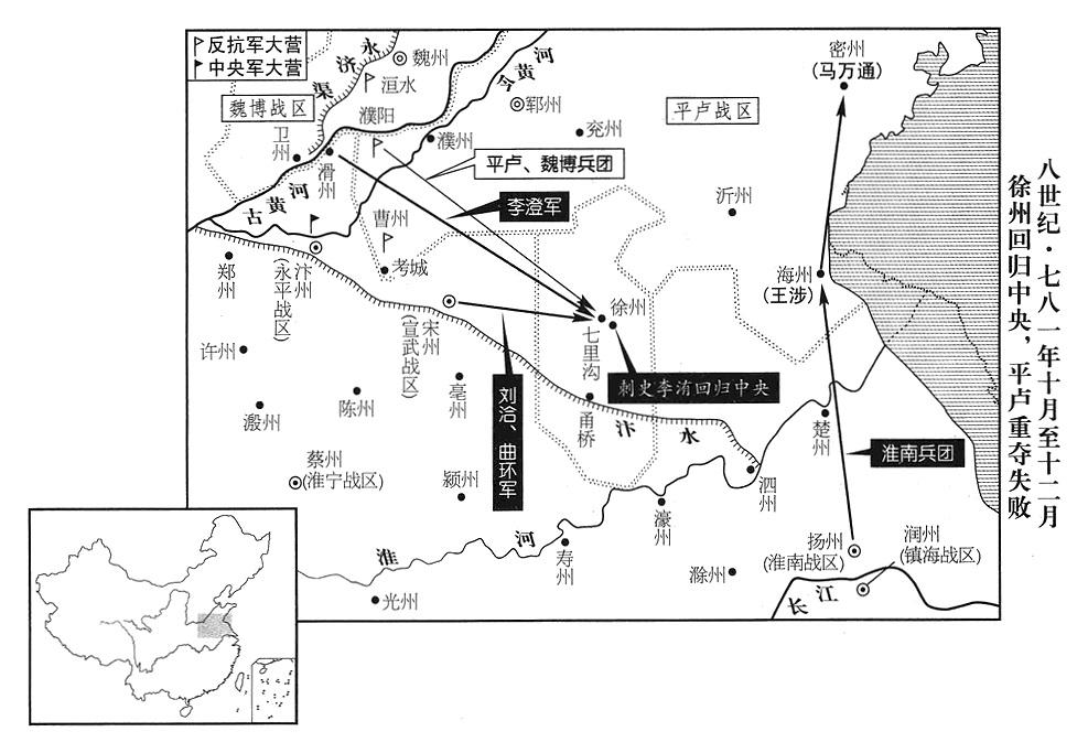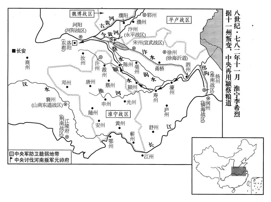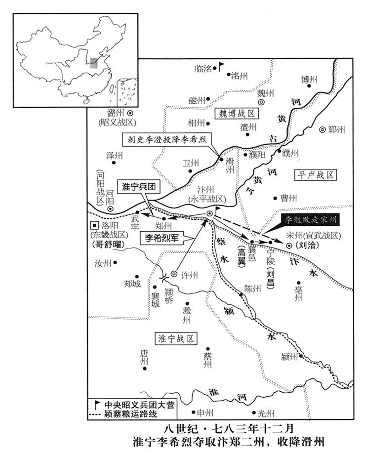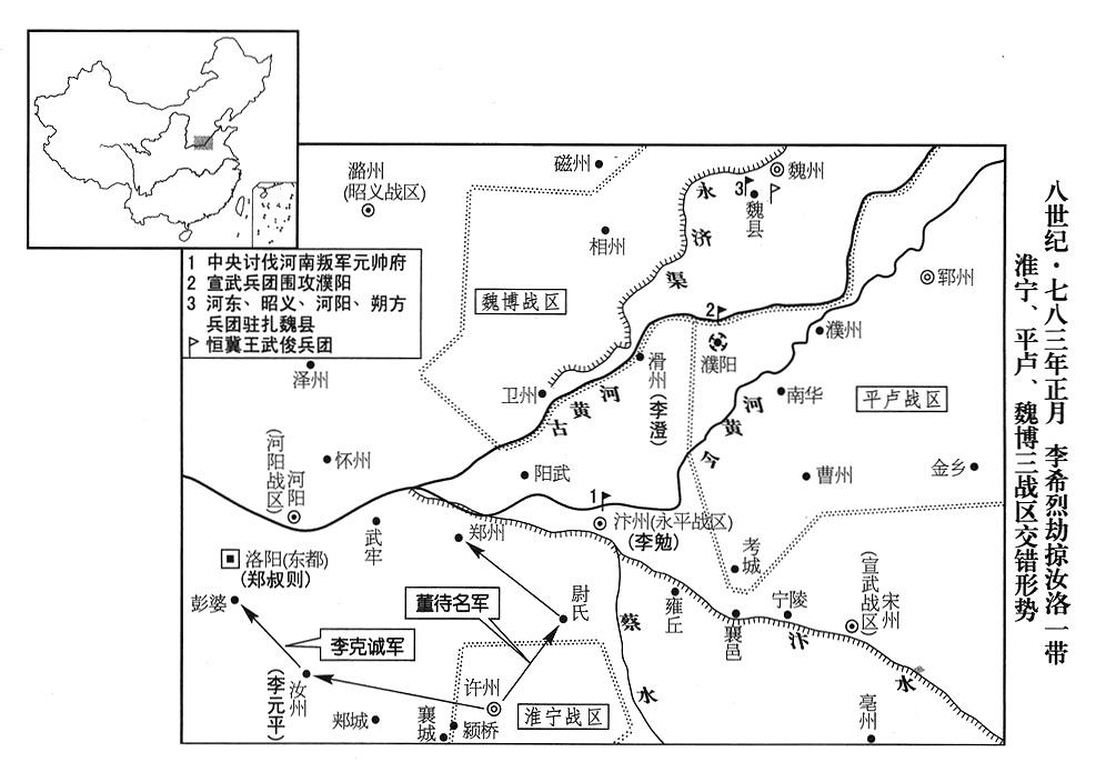 正月十七日,中央诏令另组宋亳颍战区(总部设宋州),命宋州州长刘洽(参考七七七年十月)当司令官。又把泗州划入淮南战区(总部设扬州“〔江苏省扬州市〕”)。又命东都洛阳(河南省洛阳市)留守长官路嗣恭当怀郑汝陕及河阳三城战区(总部设河阳城“〔河南省孟州市〕”)司令官。十天以后,又命永平战区司令官李勉当宋亳颍、河阳两战区总指战官(都统);把郑州(河南省郑州市)划入永平战区,遴选曾经在军中作过战的退役将领充当州长,加强防备李正己等。