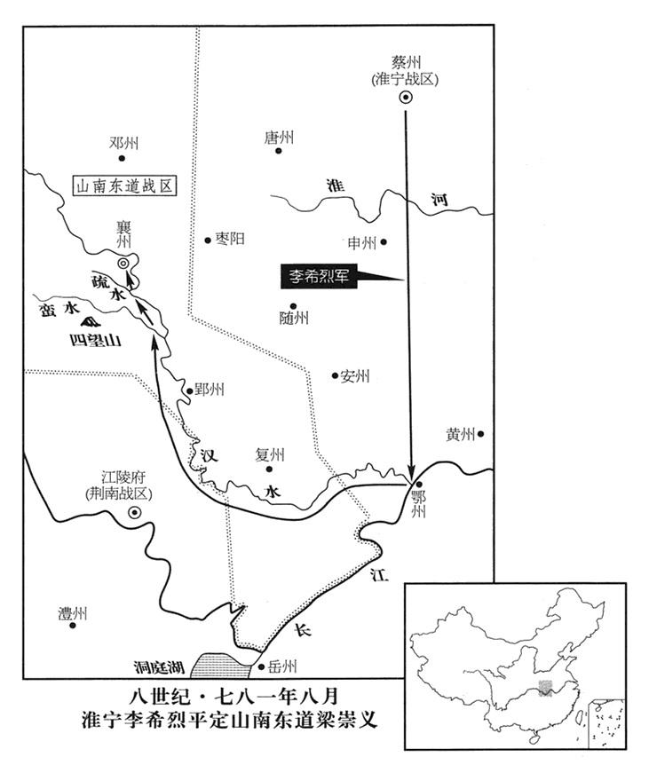23、山南东道战区司令官梁崇义,公开背叛唐王朝政府,出军南下攻击江陵;前进到四望(湖北省南漳县南),大败而归,遂把战区里所有部队集合在襄州、邓州。李希烈率军顺汉水而上,跟其他各战区特遣兵团会师。梁崇义派他的大将翟晖、杜少诚在蛮水(汉水支流,流经湖北省南漳县南)迎战,大败;李希烈追击,翟晖、杜少诚退到疏口(疏水注入汉水处·湖北省宜城市西北),又大败,两位将领向李希烈投降,李希烈命二人率原有部队先行进入襄阳,安抚慰劳军民。梁崇义下令闭城拒守,可是奉命守城的官兵却大开城门,拼命逃出,任何方法都不能阻止。梁崇义走投无路,跟妻子儿女一同跳井而死(梁崇义于七六三年三月割据山南东道,前后十九年而亡)。讨伐军捞出尸体,砍下人头,送到京师。