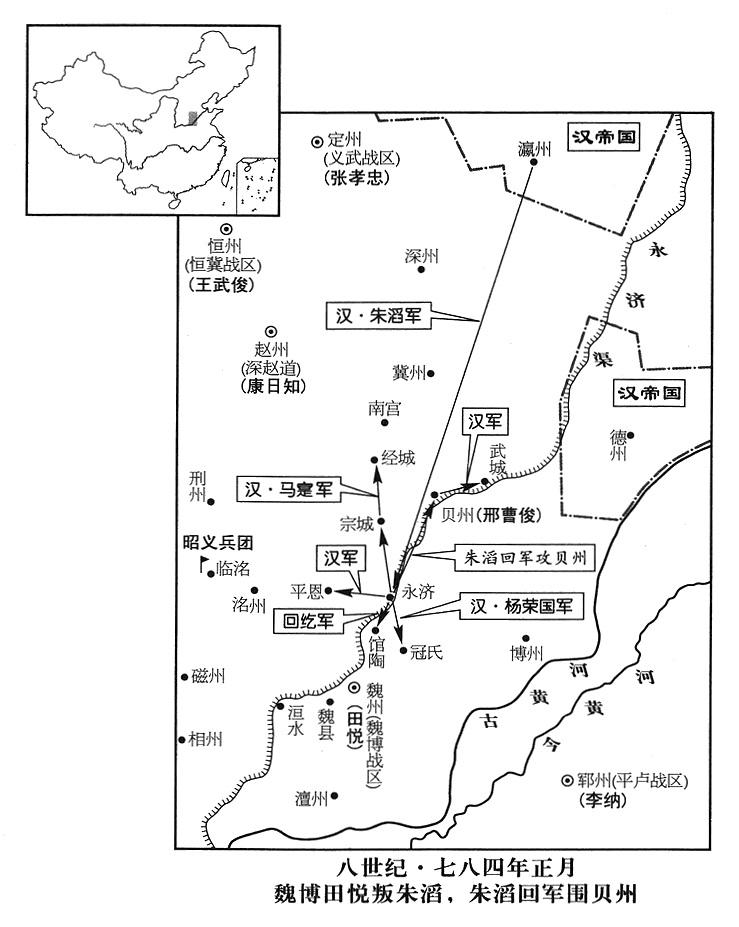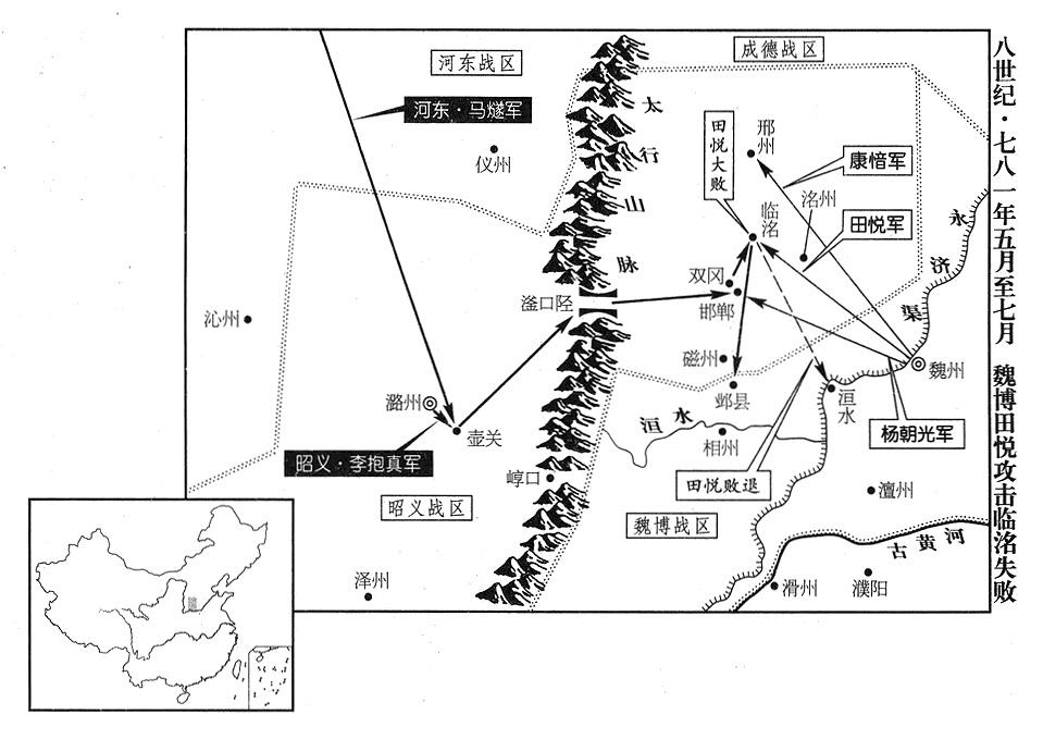 薛嵩逝世时(参考七七三年正月),昭义战区(当时总部设相州“〔河南省安阳市〕”)被分割,田承嗣夺得洺州(河北省永年县东南旧永年镇)、相州(还有贝州“〔河北省清河县〕”、卫州“〔河南省卫辉市〕”,此处没有提及);中央仍保有邢州(河北省邢台市)、磁州(河北省磁县)以及临洺县(河北省永年县)。田悦打算用高山峻岭(太行山)作为边境,说:“邢磁二州,好像两只眼睛,硬插在我们腹地,不能不夺取到手。”于是派作战司令康愔(音yīn“〔因〕”)率八千人围攻邢州,别动部队将领杨朝光率五千人在邯郸(河北省邯郸市)西北树立栅栏,切断昭义战区(即泽潞战区·总部设潞州“〔山西省长治市〕”)的救兵;田悦则亲自率数万人围攻临洺。邢州州长李共、临洺驻军司令张伾登城拒守。