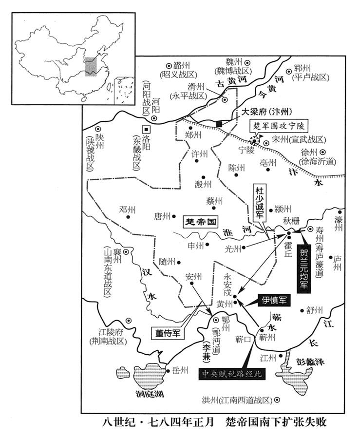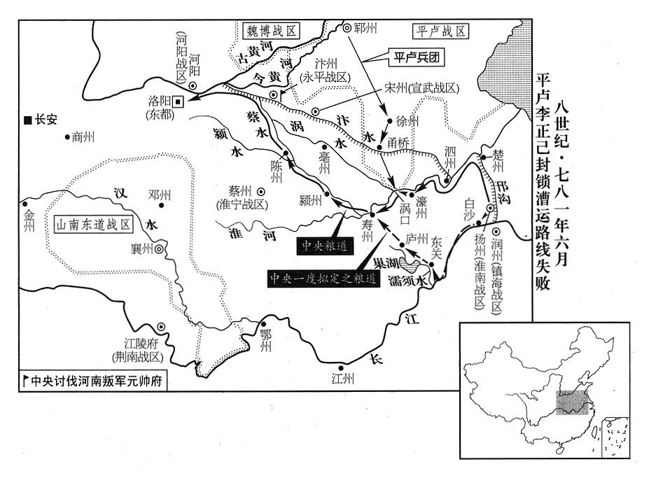 当时,从关中(陕西省中部)开始,西方包括蜀(四川省)、汉(陕西省南部);南方包括江淮(华东地区)、百闽(福建省)、南越(广东及广西);北方远到太原,所有地方都在征集民兵,开往前线。而平卢战区(总部设郓州)司令官李正己,已派军封锁徐州(江苏省徐州市)、甬桥(安徽省宿州市)、涡口(安徽省怀远县·涡水注入淮河处);梁崇义又在襄州据守,全国交通线被寸寸切断,物资不能流通,人心震动恐惧。江淮进贡的船队一千余艘,停泊涡口,不敢前进。李适征调利州(四川省广元市)州长张万福(参考七六八年十二月)当濠州(安徽省凤阳县东北临淮关)州长(使他打通涡口水路)。张万福快马前往涡口,跨在马上,驻立岸边,下令船队开航,平卢战区特遣兵团的士卒停在对岸,眼睁睁看着,不敢行动。(当时,梁崇义割据地区正是汉水下游,江汉运输线“〔参考七六四年三月〕”遂被封锁。至于平卢战区,其南境之徐州州土,最南至涡口的淮河北岸,对岸便是中央停泊的粮船,而中央取道颍水、蔡水,则必须跨过涡口,所以船队恐惧在行经涡口的一段淮河水面时,被对岸的平卢兵团抢劫。至于原有的汴水粮道,早就被平卢兵团封锁了甬桥,不得通过。按:据《新唐书·食货志》,当时江淮水陆运输总监“〔江淮水陆转运使〕”杜佑,曾提议从白沙“〔江苏省仪征市〕”出发,经东关“〔安徽省含山县西南〕”转入颍水、蔡水,进汴水而到达东都洛阳。但之后没有再提及,当是涡口解围,恢复使用邗沟、淮河。)