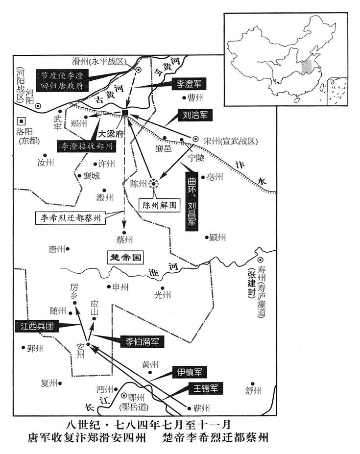 83、楚帝李希烈派大将翟崇晖率领全部主力围攻陈州(河南省淮阳县),很久不能攻克。楚政府所属永平战区司令官李澄(降李希烈事,参考去年“〔七八三年〕”十二月),发现楚政府武装部队太少,没有余力危害滑州(河南省滑县),遂把李希烈颁发的旌旗符节全部焚毁,集结部众,宣誓回归唐政府。