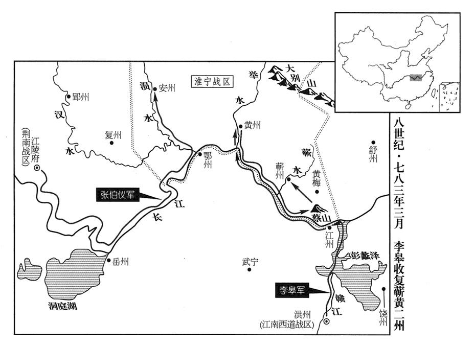 64、曹王、江南西道战区司令官李皋,派部将伊慎(蕲州“〔湖北省蕲春县〕”州长)、王锷(音è“〔饿〕”·江州“〔江西省九江市〕”州长)包围安州,楚帝李希烈派他的外甥刘戒虚率步骑兵八千人增援。李皋派别动部队将领李伯潜在应山(湖北省广水市)迎击,杀一千余人,生擒刘戒虚,把他押解到城下让守军参观,安州遂开门投降。李皋命伊慎当安州州长。