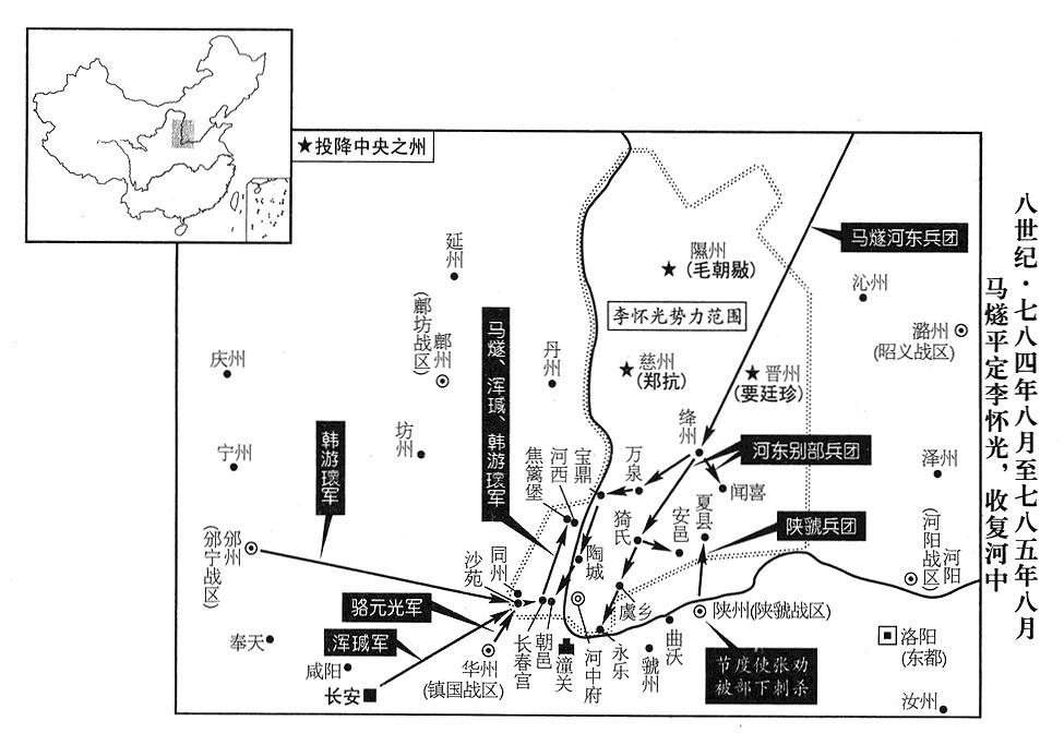 李怀光派他的妹夫要廷珍(要,姓)驻守晋州(山西省临汾市)、营门官毛朝敭驻守隰州(山西省隰县。隰,音xí“〔习〕”)、郑抗驻守慈州(山西省吉县)。马燧派人前往游说,全都归降中央。
