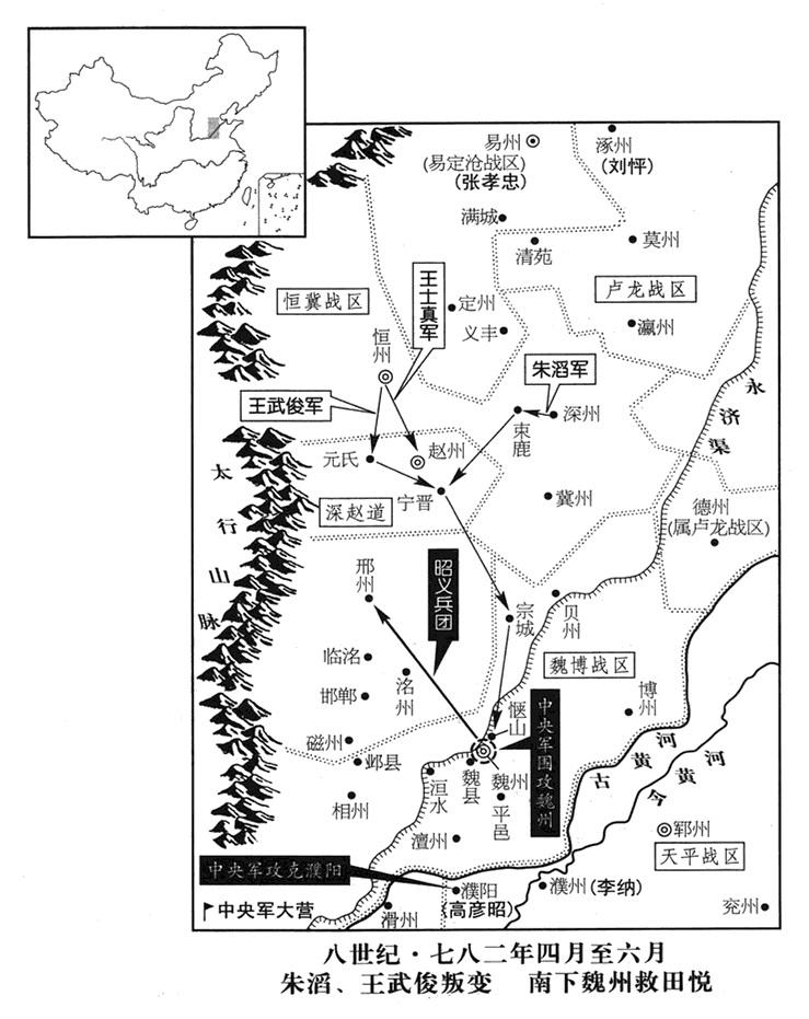 12、魏博战区司令官田悦,跟平卢战区司令官李正己、成德战区作战参谋长李惟岳,终于决定结盟,联合作战,反抗中央,派作战司令孟祐,率步骑兵五千人,北上增援恒州。