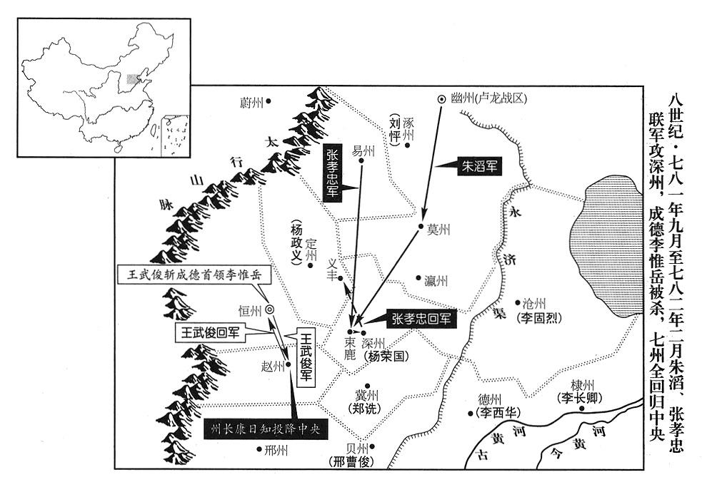 九月六日,下诏命张孝忠当成德战区司令官。令李惟岳护送老爹李宝臣的灵柩,运回中央安葬;李惟岳拒绝。张孝忠感激朱滔的指引,命儿子张茂和娶朱滔的女儿为妻,结交亲密。